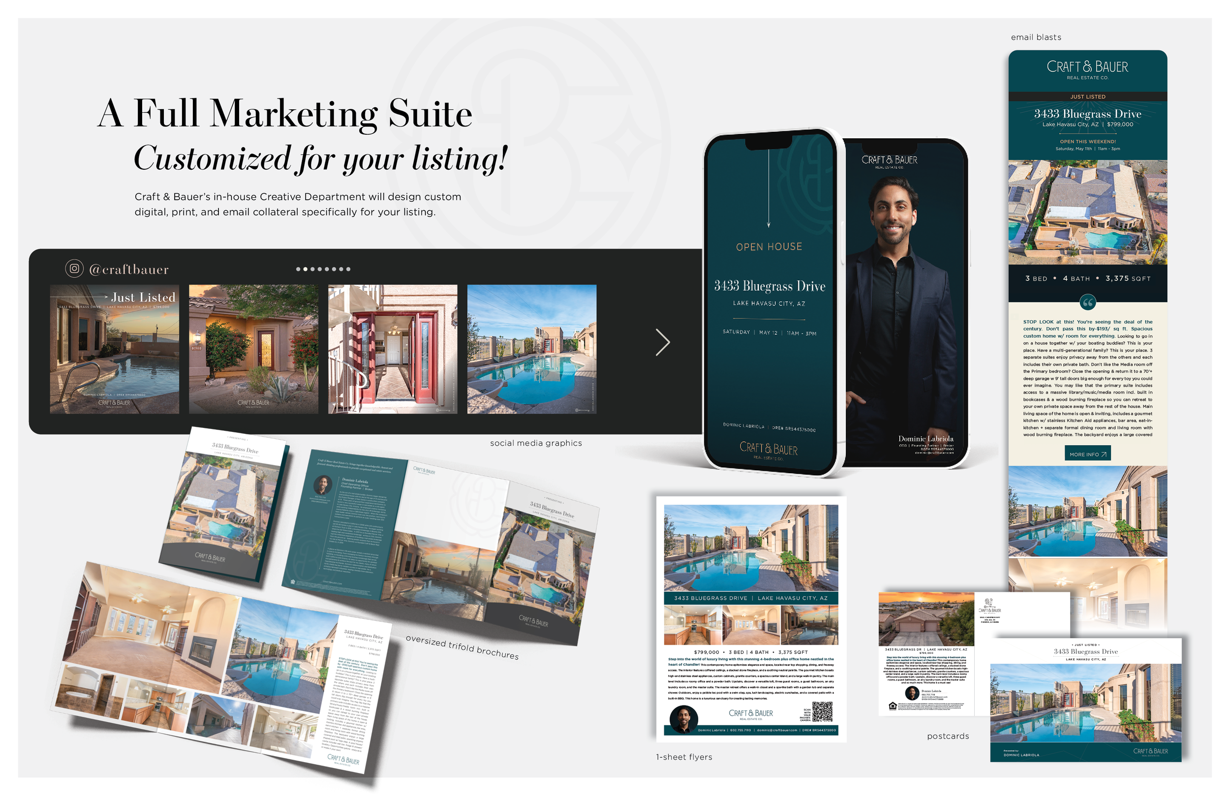 Luxe Oversized Trifold Brochures • Social Media • Email Blasts • Postcards • Flyers • Photography • Video & 3D Virtual Home Tours, & more!